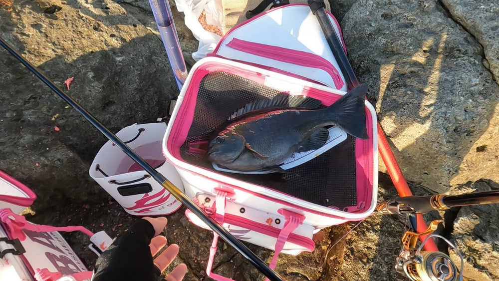 時折モヤッとウキを抑える良型グレの反応があったので、2ヒロ固定で僅かに抑え込むアタリを捉えると、ズッシリとした手応え。タモに納めた48cmのクチブトグレに嬉しく微笑み、その後潮が引いてきたタイミングで磯の突端に釣り座を構えマキエを広範囲に打ち返していると、ウキが消し込むアタリに応戦しました。しかし、あえなく針ハズレ、再度マキエを切らさないよう打ち返していると、再びウキが消し込むアタリに今度こそと集中しましたが先ほどの強さは無く浮いてきたのは55cmの真鯛でした。