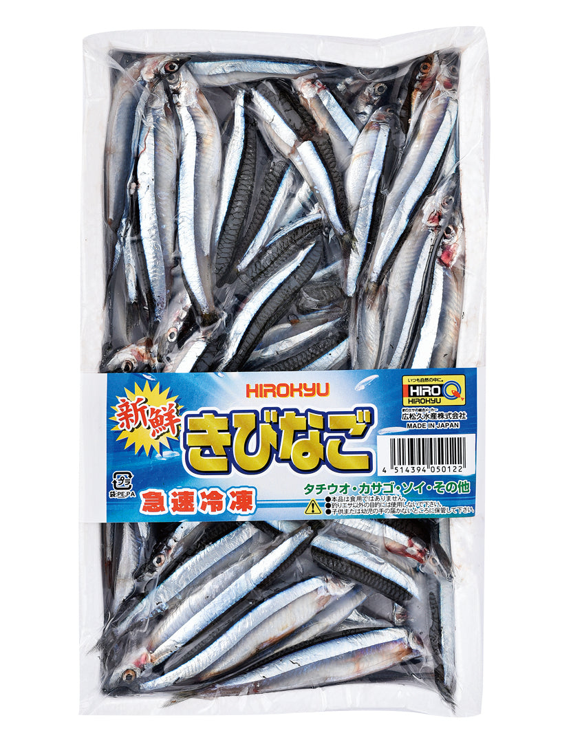 獲れたてのきびなごを急速冷凍。鮮度の良さが決め手 波止や船からのイカ釣り、太刀魚釣りに大活躍します。 また、きびなごの小粒はイカなどの他にカマスやメバル カサゴ狙いには最適サイズです。 内容量 : レギュラー 約110g