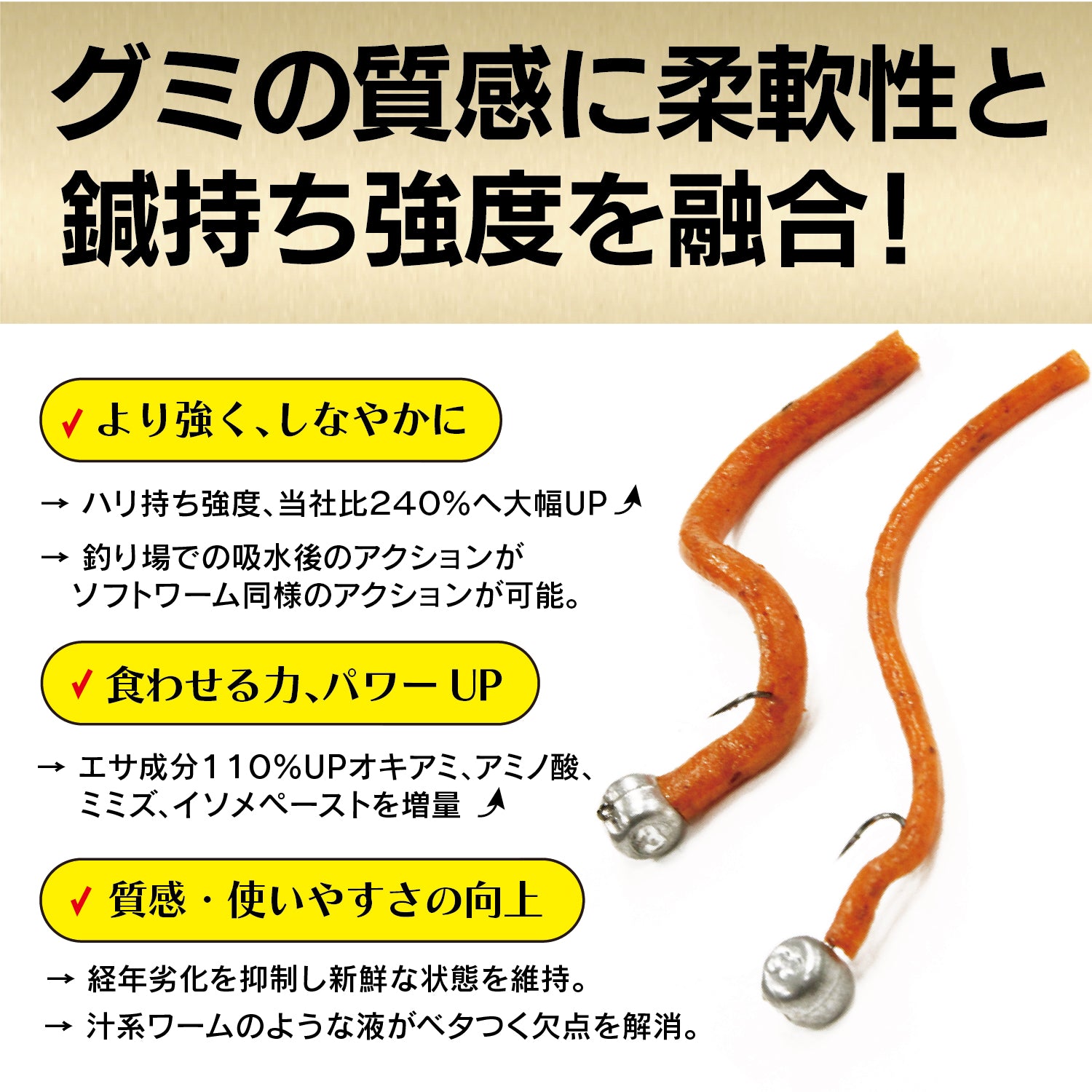 また、ハリ付けがしやすくハリから外れにくい、エサ持ちの良さにもこだわり、飛躍的に性能を向上させることに成功しました。