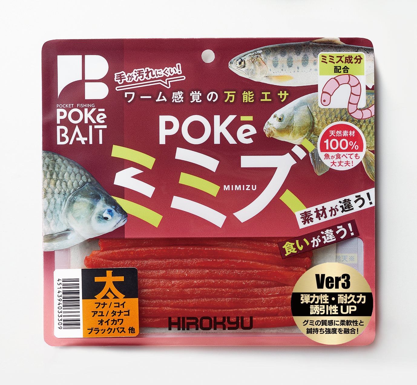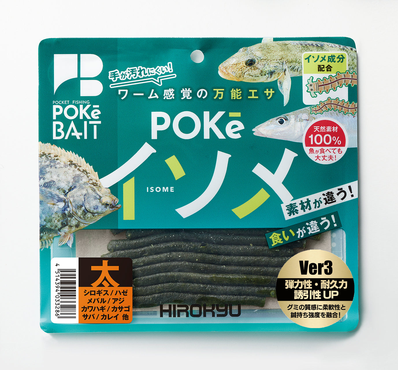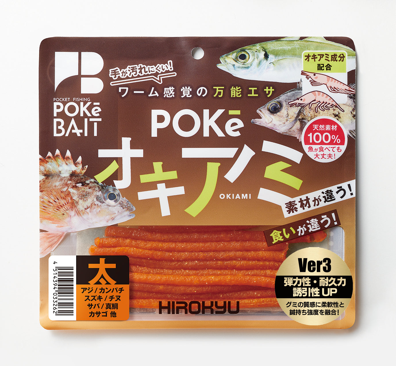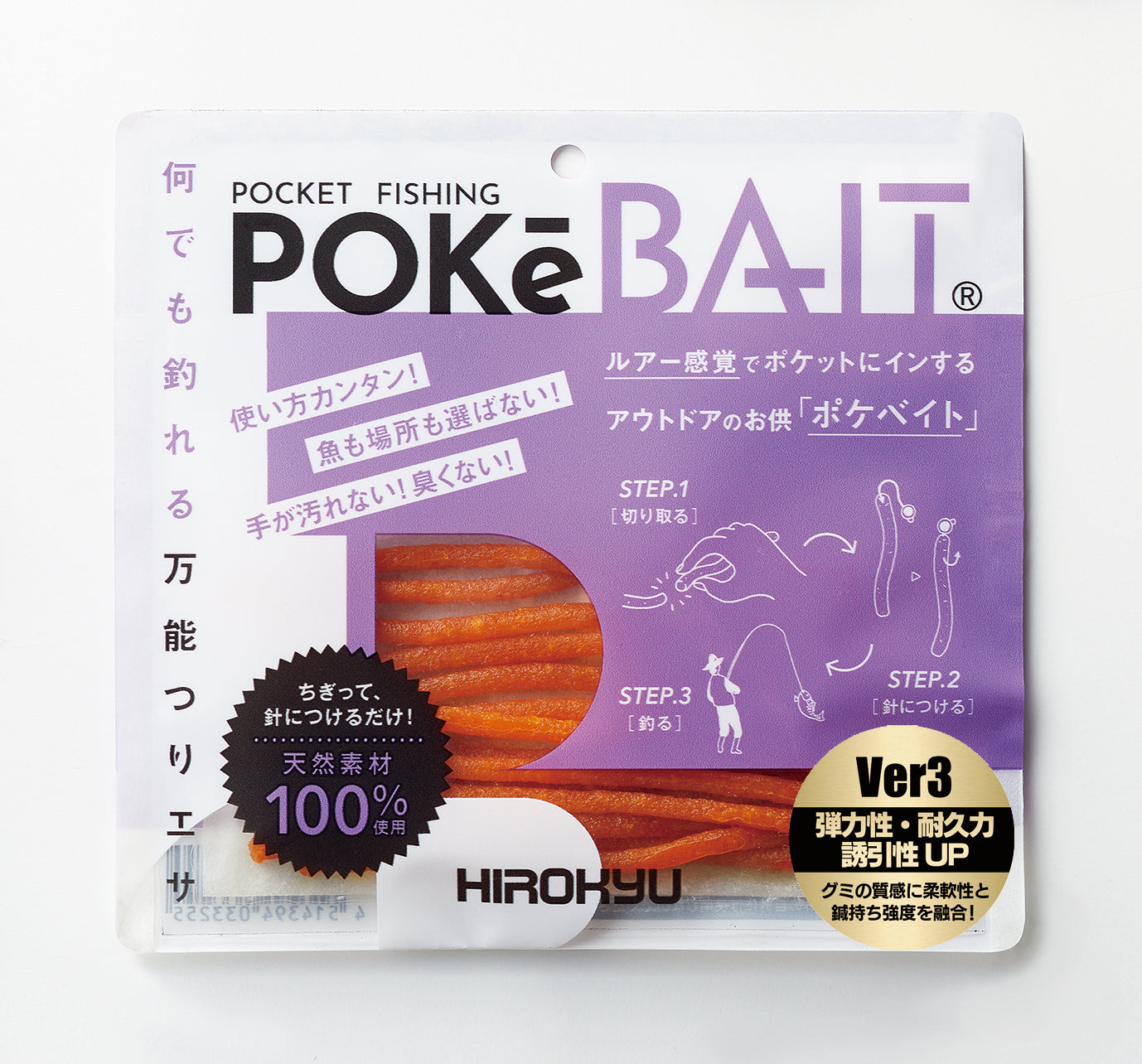 従来の「ポケベイト」から改良に3年、原材料を1から吟味し、新製法により、弾力があり柔らかく密度の細かい釣り餌が完成。ソフトタイプで魚が食べやすく、繊維質で弾力があり切れにくいため、魚を誘うアクションをつけやすく改良いたしました。